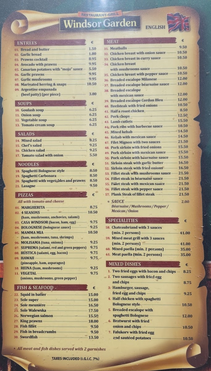 Welcome to Windsor Garden Restaurant / Pizzeria, a culinary gem nestled on Av. de Espana in Maspalomas. This charming restaurant offers a delightful blend of flavors that cater to different palates. Renowned for its warm and attentive service, diners rave about the exquisite breakfast options, particularly the “best scrambled eggs on the island.” Breakfast here is a hearty affair, featuring crispy bacon, ample toast, and refreshing drinks.